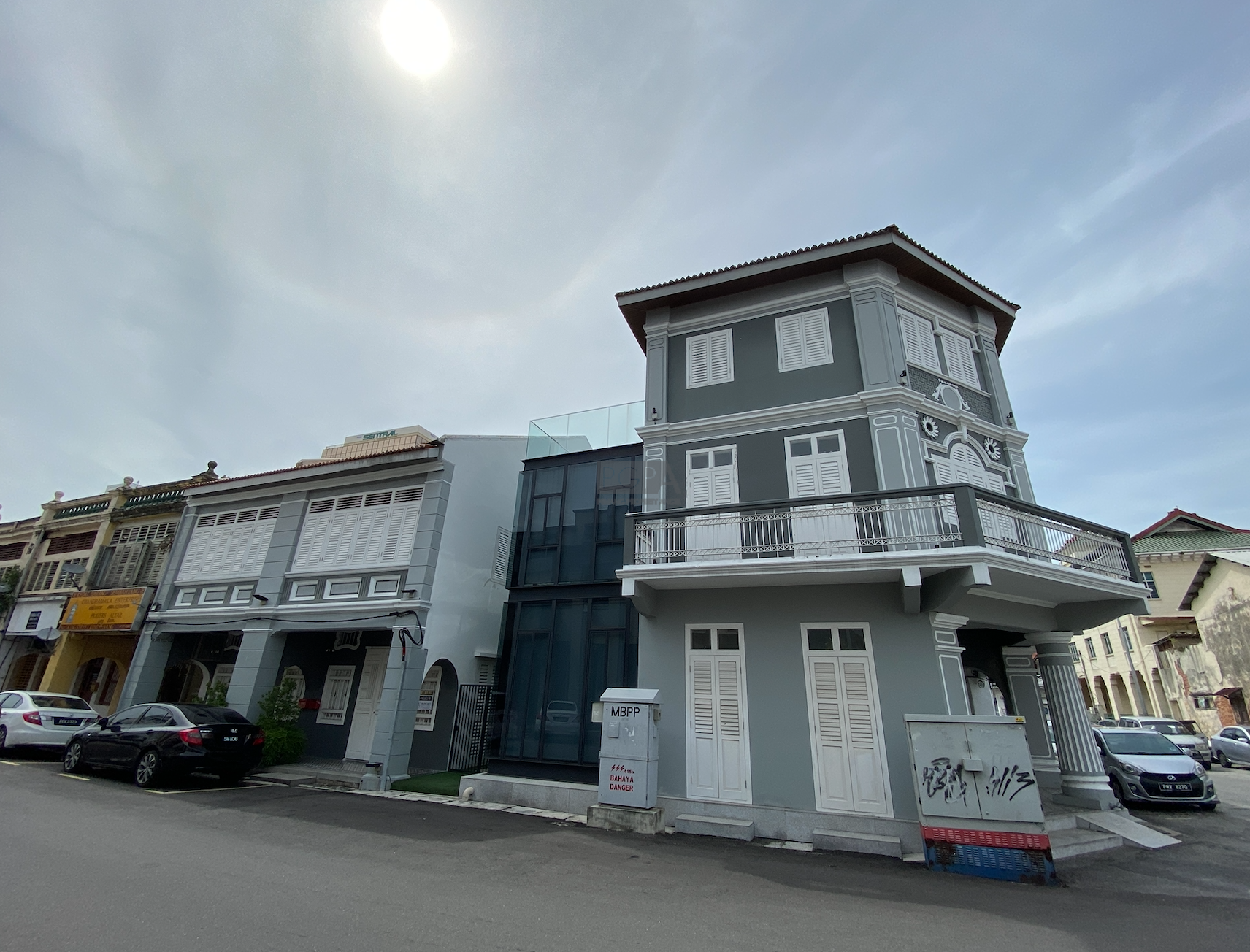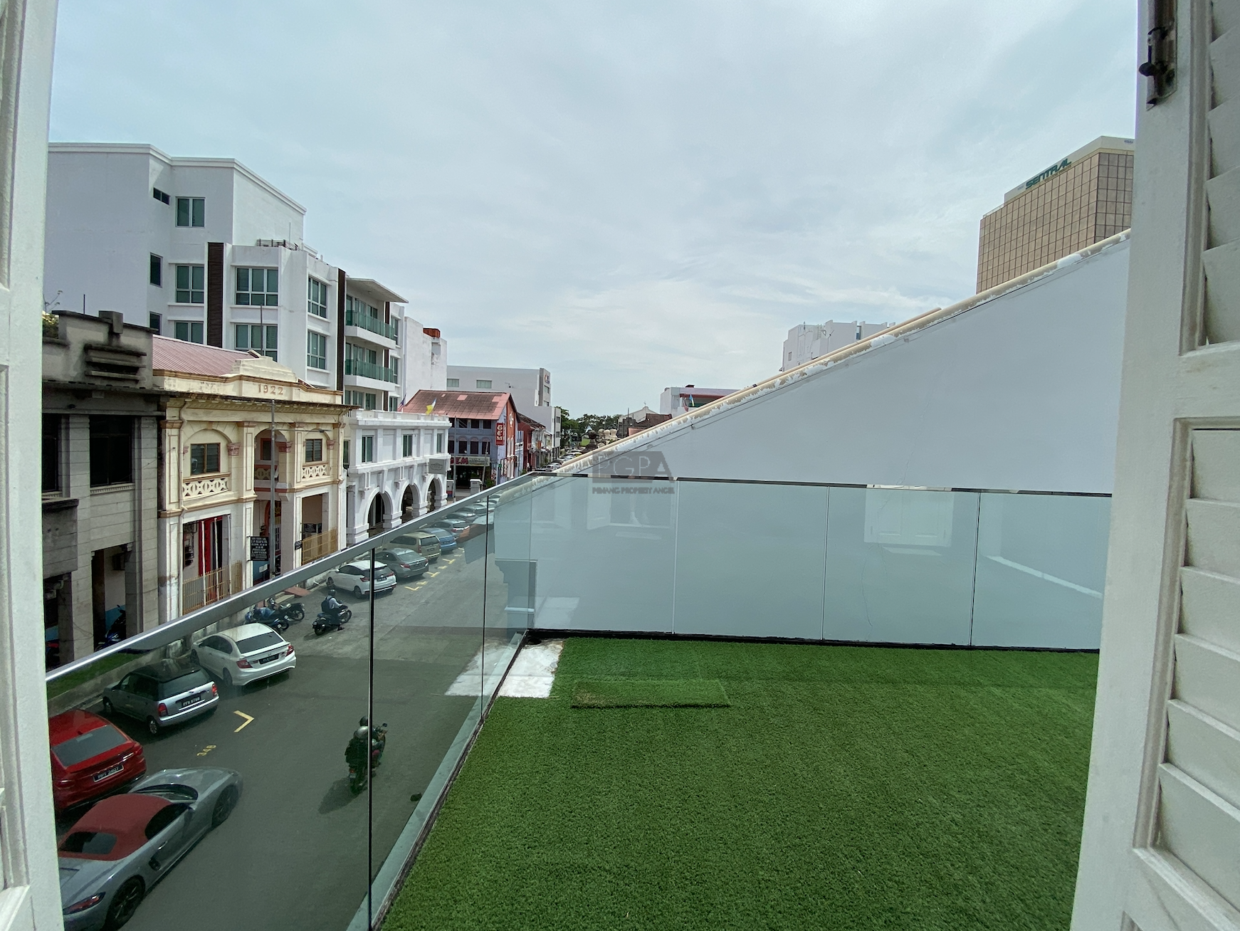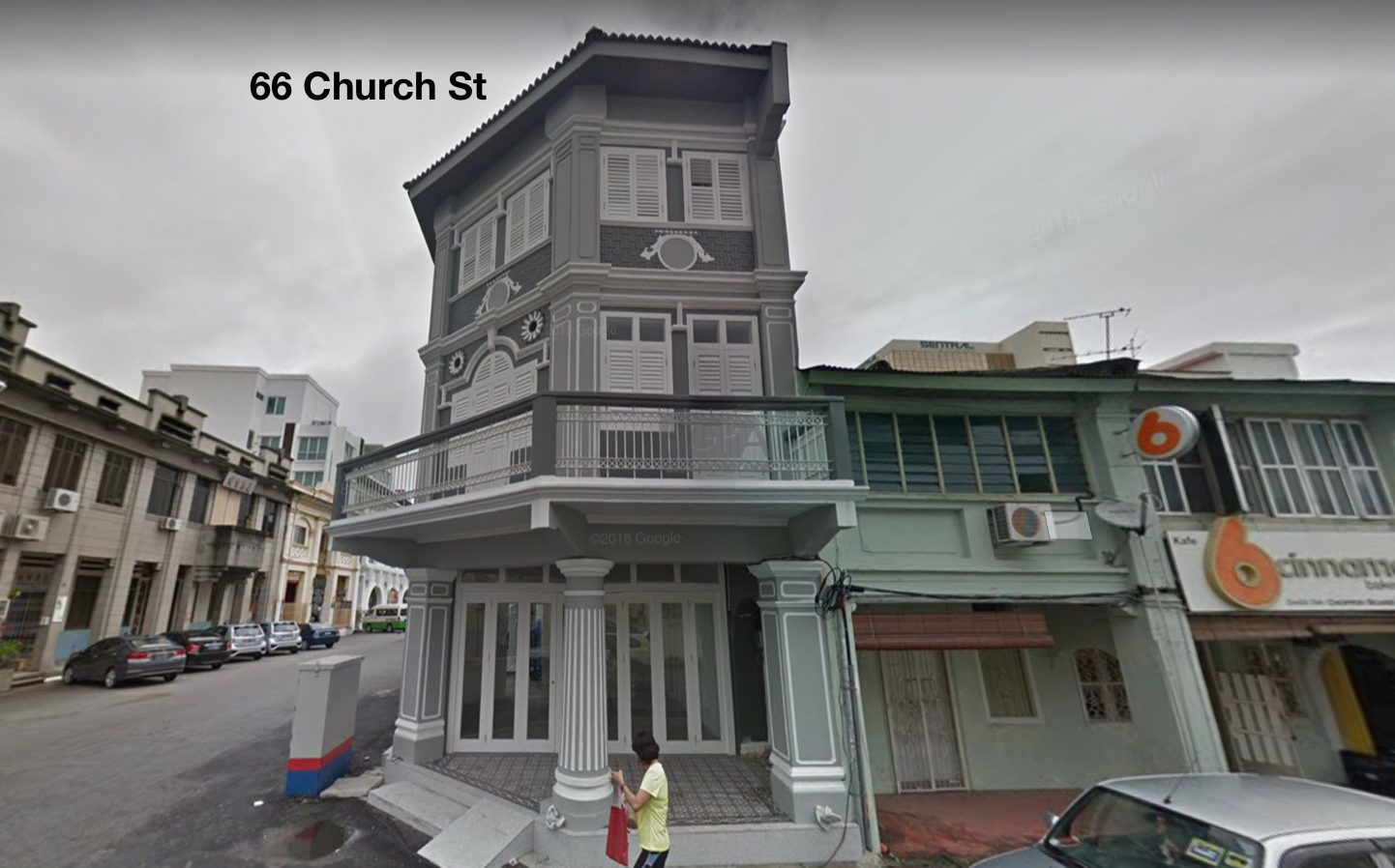 The corner property at 66 Church Street spans three storeys with a total built-up area of about 1,800 sq. ft. Notable highlights include French windows, wrap-around balconies on the upper levels, and a rooftop outdoor area that offers sweeping views of the UNESCO heritage city. This building occupies a land plot of approximately 662 sq. ft.