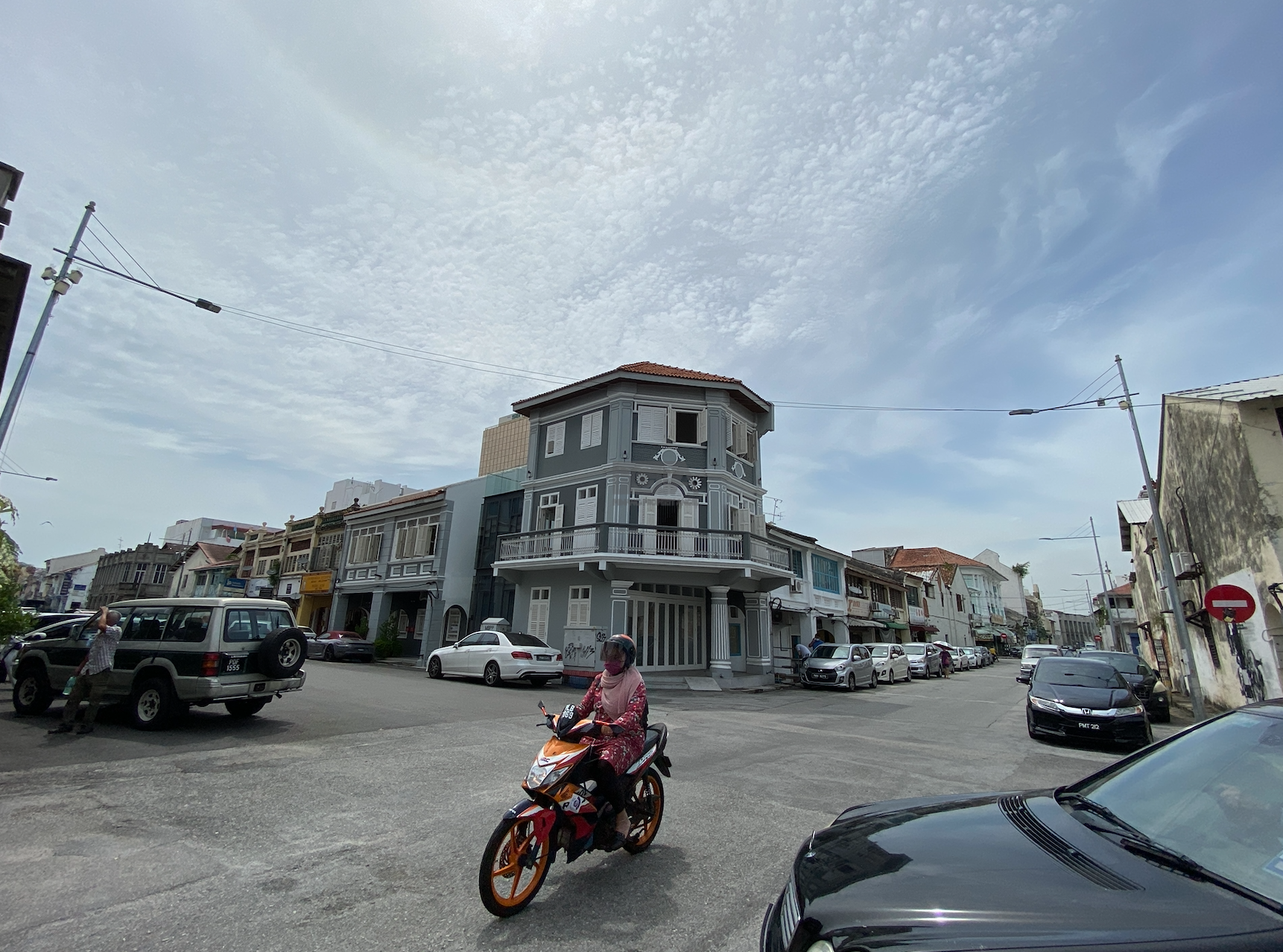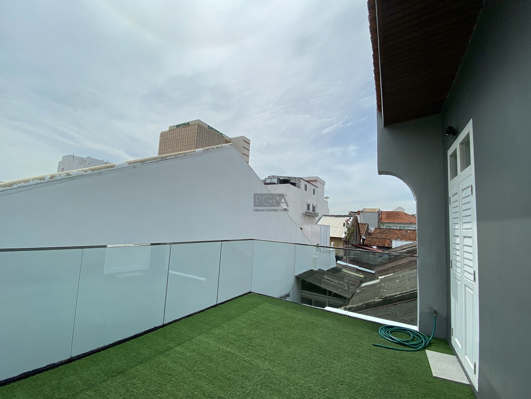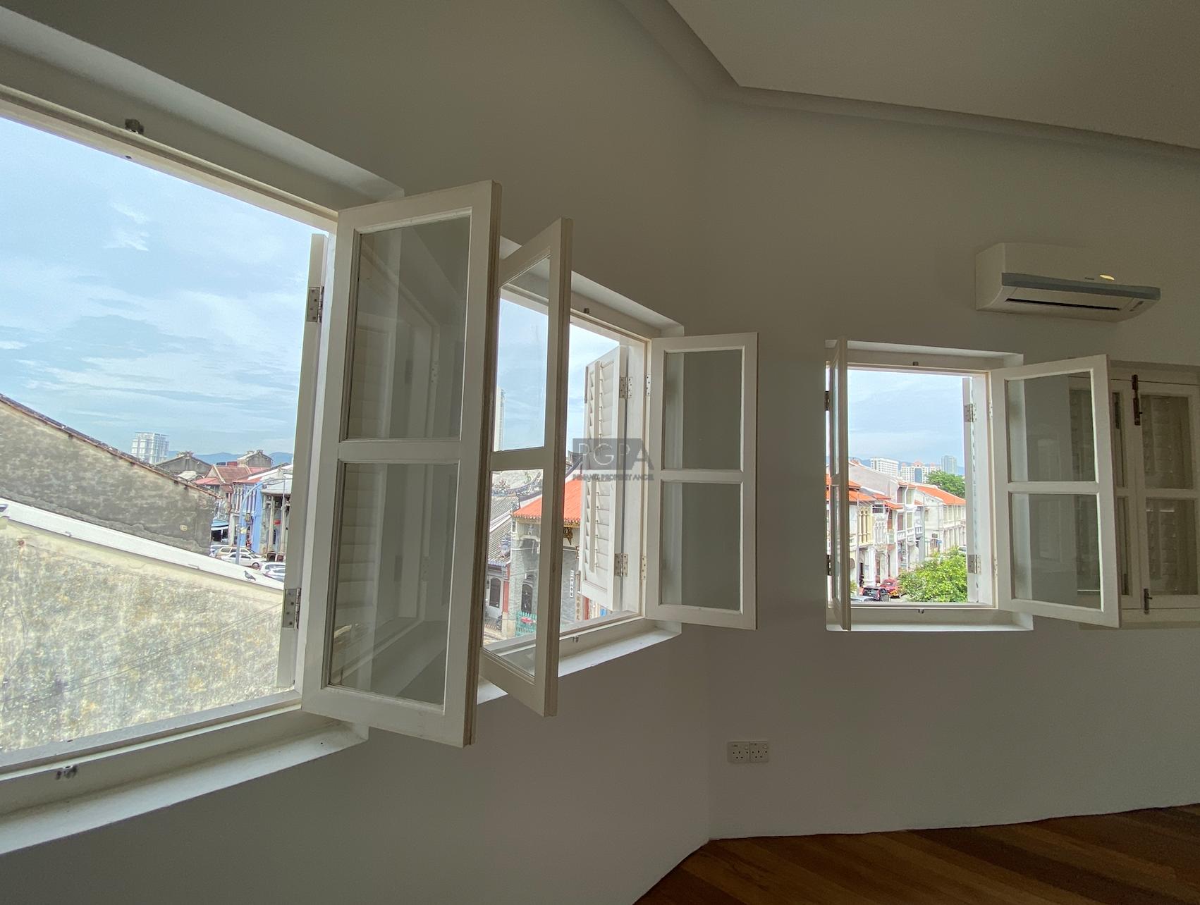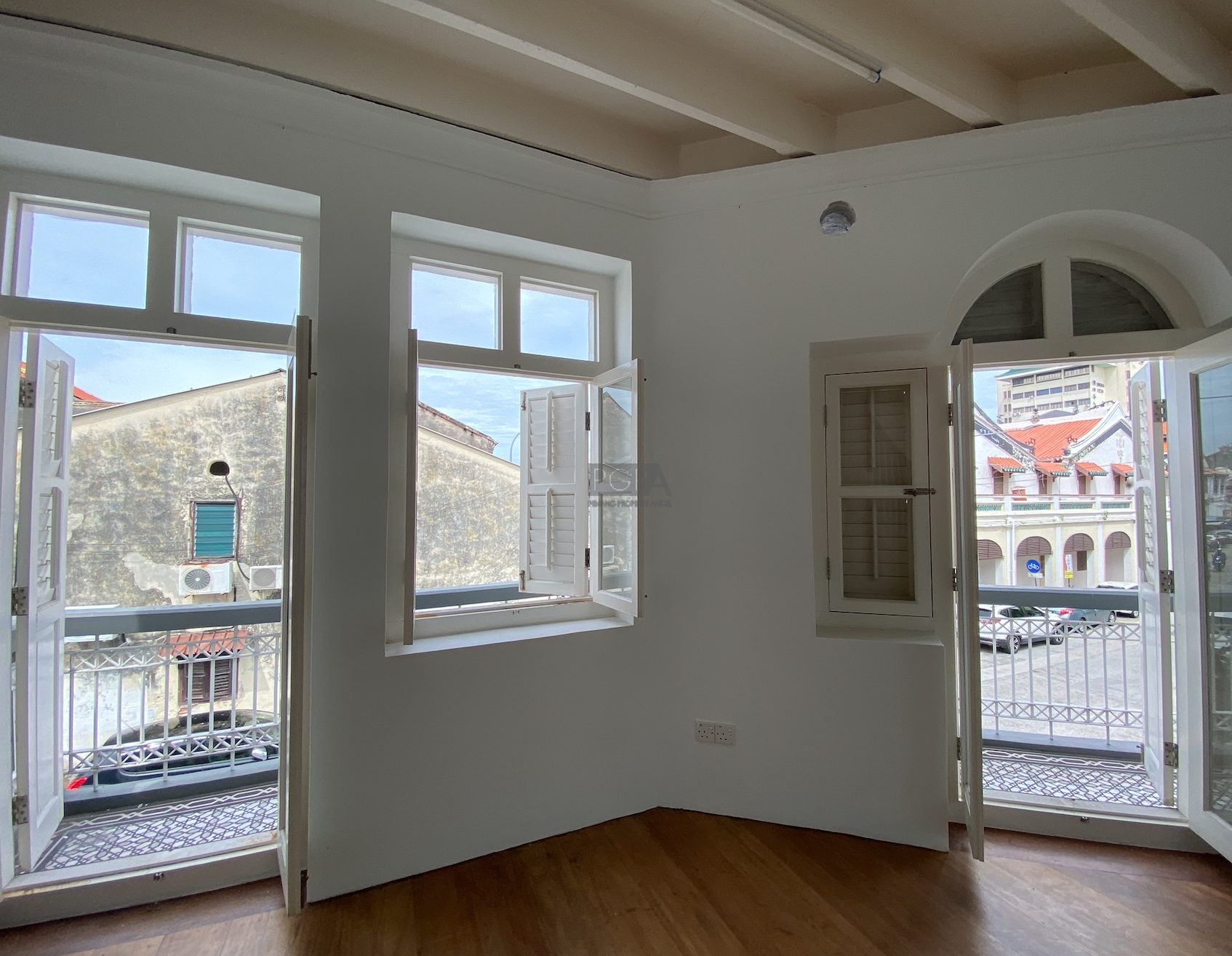 The corner property at 66 Church Street spans three storeys with a total built-up area of about 1,800 sq. ft. Notable highlights include French windows, wrap-around balconies on the upper levels, and a rooftop outdoor area that offers sweeping views of the UNESCO heritage city. This building occupies a land plot of approximately 662 sq. ft.